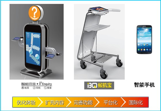 智能終端主要包括大屏固定島、移動島以及智能手機三種。固定島放置于機場的出發大廳及到達大廳,用于旅客自助搜索查詢信息。移動島即i3Q候機寶,在機場行李車上安裝終端產品,向旅客提供行李載運、導航(室內GPS)、登機引導、登機提醒、休閑娛樂等服務。