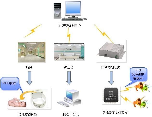 通過在嬰兒身上佩戴可發送RF信號且對人體無害的電子標簽,同時在醫院內需要進行控制的區域安裝信號接收裝置;信號接收裝置可以隨時接收嬰兒電子標簽所發出的射頻信號,并據此信號判斷標簽所處的狀態,從而對嬰兒所在位置進行實時監控和追蹤,對企圖盜竊嬰兒的行為及時發出報警提示,配合帶有SYN6658智能語音芯片的門禁控制系統后可以有效防止盜竊嬰兒事件的發生。內置的語音合成芯片SYN6658支持強大的中文字庫,能夠清楚、及時、準確的針對異常情況的播報不同的提示信息。