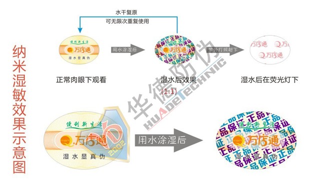 如今,濕敏防偽技術完美登場,深圳市華德防偽技術開發有限公司歷經數年,研發出了最適合在酒產品上使用的專用標簽——濕敏綜合防偽。“濕敏綜合防偽技術”是我司獨家擁有的自主知識產權,它的特點是:涂水識別方便、快捷、判斷及時、準確。技術獨家專有,能有效杜絕產品被惡意假冒,并能快速提升產品知名度,增強市場競爭力。