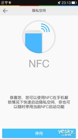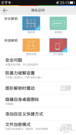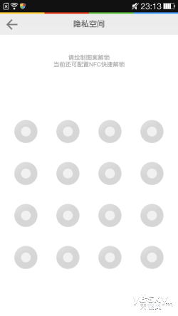 當我們首次進入隱私空間時,便可以看到LBE安全大師的安全提示。在以往的版本中,LBE安全大師隱私模式只能通過繪制圖案等方式進行訪問,而在新版本中我們還見到了“當前還可配置NFC快捷解鎖”的字樣,這意味著我們可以通過NFC標簽來快速訪問。