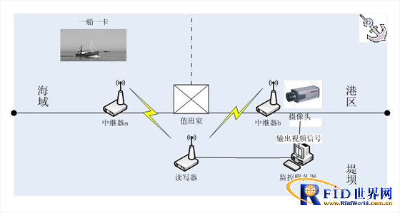 主要實現思路為:將“RFID電子標簽”粘貼于船舶駕駛艙中,實現一船一卡。在船舶進出區域的內外用立桿各安裝一臺“RFID中繼器”(其中1個或2個立桿加裝攝像頭,用于對過往船舶進行拍照),在崗亭或值班室安裝“RFID讀寫器”并與監控計算機連接。