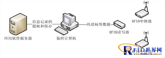 系統由“應用軟件服務器”、“監控計算機”、“RFID中繼器”、“RFID讀寫器”和“RFID電子標簽”組成。