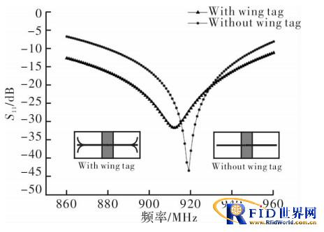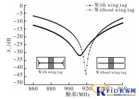 圖4有無翼型結構的類偶極子標簽天線S參數對比