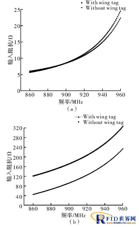 圖5 標簽天線在有無翼型結構時的輸入阻抗對比