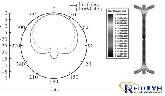 圖6標簽天線在915 MHz的增益圖及類偶極子天線的表面電流分布