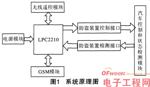 系統主要由ARM嵌入式控制器、手機模塊、無線遙控模塊、汽車控制和狀態檢測模塊4部分組成。汽車控制和狀態檢測模塊將車輛相關數據采集給ARM嵌入式控制器,ARM嵌入式控制器再將其傳給手機模塊和無線遙控模塊,最終達到報警的目的。系統原理如圖1所示。