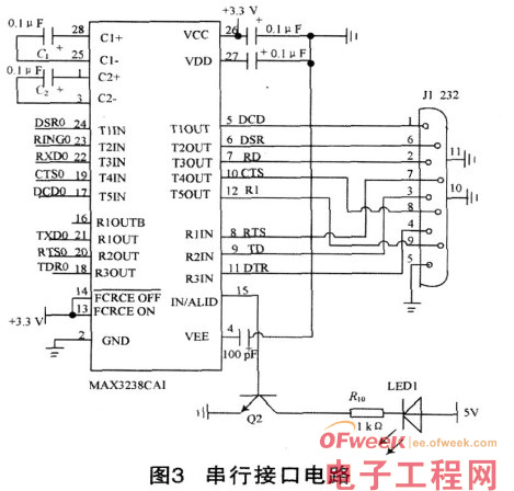 GSM模塊和系統處理器通過串行TIUTRS232標準串行總線進行數據交換。所有操作的高電平都是CMOS電壓(2.65V),因而,RS232轉換芯片的邏輯電平必須采用低壓供電形式(3.3V),不能用5V的串口轉換芯片。在設計中選用了MAX公司的MAX3238實現數據轉換。MAX3238是MAX公司生產的3.3V邏輯電平串行轉換芯片,和常用的MAX232具有相同的特性,只是邏輯電平是3.3V.模塊和處理器的串行通信完全符合通用串行總線標準。具體硬件接口電路如圖3所示。