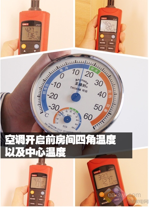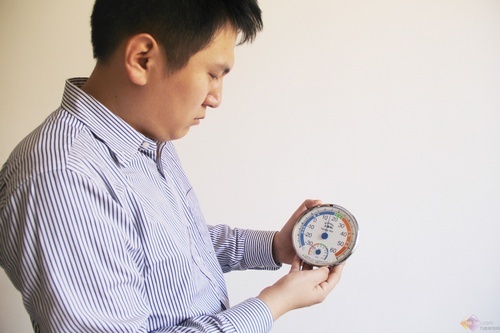 在空調開啟之前,我們通過溫濕度計測試了房間內四個角落的溫度,分別為12度、11.6度、11.7度、12.7度,相對于房間中心溫度略低一些。