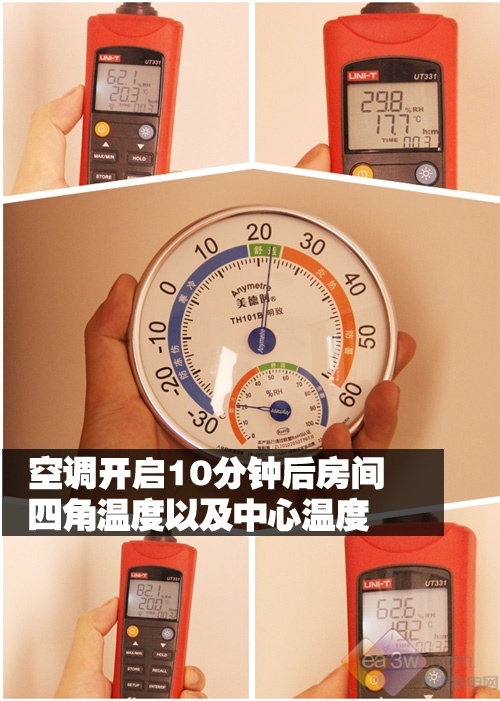 那么房間溫度提升了多少呢?我們再次通過溫濕度計測試了房間內四個角落的溫度,分別為17.7度、20.3度、20度、19.2度,房間中心溫度為23度,達到最佳的舒適溫度。通過數據我們發現,開啟美的空調制熱以后,在十分鐘的時間內,室溫達到了8攝氏度的快速提升,從制熱速度和時間上都有著不錯的表現。