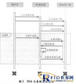 由于信息采集點分散,數目眾多,數據采集過程與生產過程存在時空上的交叉,傳統實現方式下的數據實時性、準確性將受到很大制約,因此系統采用數據采集與業務處理相分離的技術手段,在PDA上完成數據采集與部分信息的維護,在PC機上完成數據驗證、業務處理等其他功能。考慮到加工場地的分散性以及大型設備設施對信號的干擾影響,系統在PDA與PC之間通過USB接口連接,采用SOCKET的通訊協議,定義遵循XML標準的3種消息:WaitForInput、Datalnput、DataAccept,實現信息的快速采集。