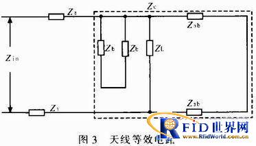 天線是應答器設計最為關鍵的部分。圖2的天線結構圖采用彎曲振子臂結構的小型化印刷偶極子天線。饋電方式為微帶通孔巴倫,基板底層為天線臂、巴倫線和接地板,頂層為饋線,通過通孔相連兩層,在給定介質基板FR4(玻璃布環氧樹脂)上刻蝕銅貼片制成。擬定中心頻率為905 MHz,輸入阻抗接近純電阻50 Ω。天線等效電路如圖3所示。