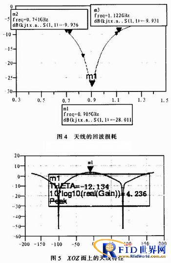 利用ADS軟件的正交面描述天線功能,如圖5從XOZ面上看天線的增益為4.236 dB。
