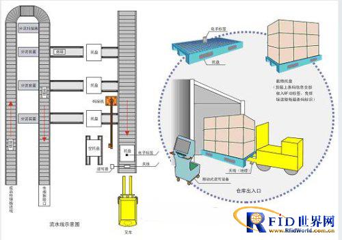 (1)成品貨箱入庫——帶電子標簽的空托盤進入托盤入口,由讀寫設備對電子標簽進行讀寫測試,