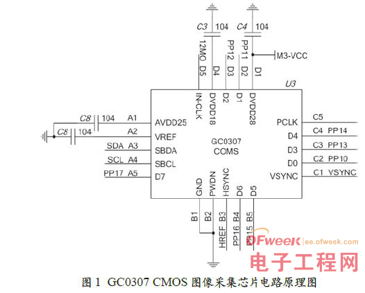圖1 所示為格科微電子有限公司的光學GC0307 CMOS 圖像采集芯片應用電路原理圖。該款CMOS 圖像采集芯片是高精度、低功耗、微體積的高性能相機的內置式組件,它把實現優質VGA 影像的CMOS 影像傳感器與高度集成的影像處理器、嵌入式電源和高質量的透鏡組結合在一起,輸出JPEG 圖像或圖像視頻流,支持8/10 位數字傳輸JPEG 圖像和YCbCr 接口,提供了完整的影像解決方案。