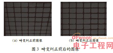 通過公式(1)和公式(2)可以得到從(x,y) 到(u,v) 的變換,其中,A ~ H 由光路決定,可以由具體測定數據最終確定,通過實測可以獲得原始數據。圖3 所示展示了原始圖像和畸變糾正前后圖像的效果差異。通過變換可見,畸變糾正后的圖像通過變換可達500 DPI分辨率,為后續獲得高質量圖像處理數據奠定了基礎條件。