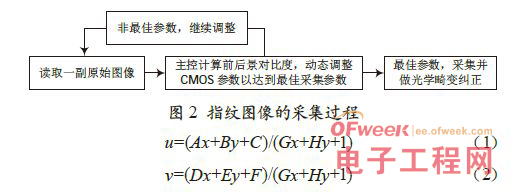 本系統的指紋圖像采集過程如圖2 所示。系統軟件設計部分則針對畸變糾正采用了四點轉正算法。