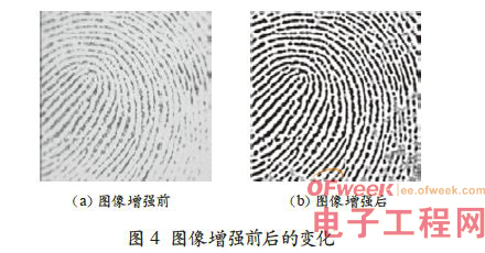 如圖5 可見,改進的Sobel 算子在原Sobel 算子的基礎上,能顯著地分割出正確圖像的面積,幾乎能在整個畫面區域提取出正確的方向來。系統對圖像進行了Gabor 濾波和圖像數據二值化。指紋圖像屬于紋理圖像,紋理圖像采用Gabor 濾波器,利用每一點的點方向沿方向指向增強,沿方向的法線方向減弱。Gabor 濾波器能很好地拼接斷紋,濾除環境噪聲,最后將Gabor 濾波后的圖像做雙窗口均值門限二值化: