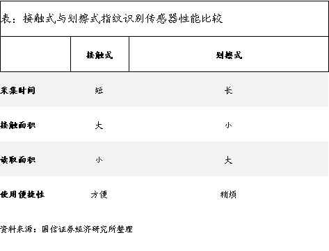 另外我們看到,S5的指紋識別傳感器使用的是Swipe方式,以“長條型”與Home鍵結合。我們在之前的深度報告中有分析過Swipe sensor與Area sensor(iPhone 5S采用)的差別:Swipe式指紋識別傳感器需要一定的角度和一定的速度滑過手指才能被準確識別,在用戶體驗性方面弱于蘋果的Area按壓式傳感器。