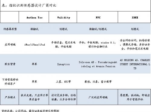 Area sensor做的最好的是AuthenTec,其他廠商差距還較大。自從AuthenTec在2012年7月被蘋果收購后就不再對外銷售傳感器,三星、HTC等等其他手機廠商只能找Validity、FPC、映智、神盾(實力依次排序)等廠商合作。而目前Validity還主要是做Swipe Sensor,FPC的Area sensor面積較大,主要供給銀行使用,小面積的Area sensor還不成熟,另外神盾科技的Area sensor也是剛流片完,正在客戶送樣,映智的Area sensor也還沒有成功應用。