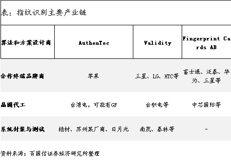 蘋果Authentec產業鏈:AuthenTec完成傳感器軟件算法和方案的設計—臺積電(2330.TW)完成晶圓代工—臺灣精材(3374.TE)、蘇州某廠商完成晶圓級封裝—日月光(2311.TW)負責后續封裝與測試以及SiP模組制作(環旭電子(601231,股吧)將切入)。
