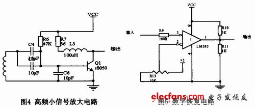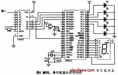 。數字恢復電路采用LM393,如圖5所示,它的作用是將解調輸出模擬信號恢復為數字信號,以便解碼器識別。解碼、單片機顯示控制電路如圖6所示。