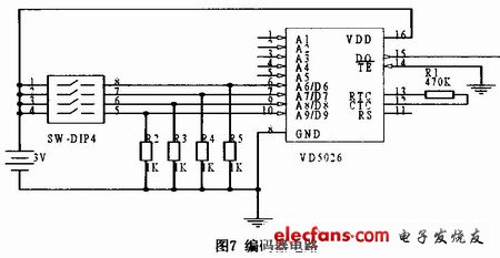 編碼器設計由撥碼開關和編碼芯片VD5026構成,信息由撥碼開關生成。電路圖如圖7所示。