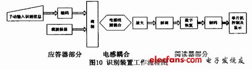 識別裝置工作流程如圖10所示。此無線識別裝置由手動輸入信息,經編碼器編碼,采用ASK調制方式,載波為13.56MHz,經線圈耦合發送。閱讀器將接收到的ASK信號放大后,經二極管包絡檢波,送至數字恢復電路后,再解碼。解碼正確時,由單片機顯示結果。