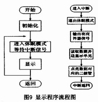VD5027解碼正確時,17管腳輸出高電平,4位數據由管腳10、11、12、13輸出。因此單片機設置為中斷模式,VD5027的 17管腳經反向后接在單片機的中斷0入口處。主程序為休眠等待狀態,當有應答器且解碼正確時,響應中斷服務子程序,顯示相應的信息。其流程如圖9所示。