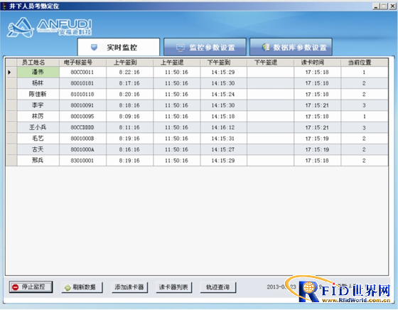 工作原理:為每位員工配發“RFID電子標簽”,實現一人一卡。在礦井內分段安裝“RFID讀寫器”,值班室配發管理電腦并安裝管理軟件。