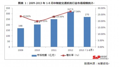 一、2011年,中國智能交通行業應用總體市場規模達到250億元,比2010年201.9億元增長了23.55%,2012年隨著各地智慧城市建設的推進,在智能交通行業IT應用投資方面加大了力度,2012年比2011年增長了27.56%,規模達到了317.5億元。2012年中國城市智能交通市場千萬級項目數量235項,同比增長26%,千萬級項目市場規模合計68.1億元,同比增長46%。2009-2013年1-8月中智能交通系統行業市場規模如下。
