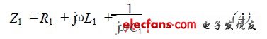 圖4中,閱讀器的發送器出口產生高頻電壓u2,接收器直接與天線線圈L1連接。串聯諧振電路的總阻抗Z1為各項單阻抗之和,即: