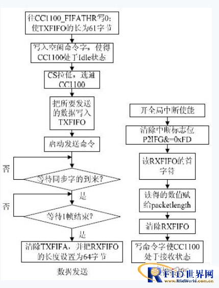 CC1100 與MSP430 采用SPI 接口連接,圖1 中已經給出了它們之間的連接方式。SPI 總線接口技術是一種高速、高效率的串行接口技術,主要用于擴展外設和進行數據交換。MSP430控制CC1100 進行數據發射和接收數據的流程如圖2 所示。