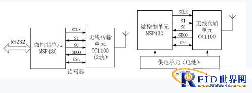 讀寫器中數據傳輸單元由兩塊 CC1100 組成,其中一片工作于315MHz,用于發射單頻點載波,形成激活場區,另一片工作于433MHz,用于與應答器進行半雙工通信;控制單元采用TI 的超低功耗單片機MSP430,降低了系統功耗。控制單元用于配置CC1100 寄存器,處理CC1100 接收到的數據,并向外提供RS232/485 接口。應答器中數據傳輸單元為一片CC1100,用來與讀寫器進行無線通信;控制單元用于配置CC1100 寄存器,并對CC1100 的狀態進行管理。