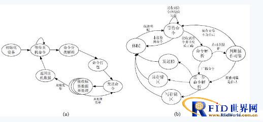 讀寫器部分軟件的工作流程如圖 3(a)所示,讀寫器一直等待主機命令,接收到主機命令后,根據主機需求將命令解析成讀寫器對應答器相應操作,例如:提取場內所有應答器ID,對場內某些應答器的存儲器進行讀寫等。命令發送后,讀寫器等待應答器的應答數據,與應答器進行無線通信。當讀寫器執行完主機命令,完成于應答器的通信后,將需要返回的數據或狀態通過讀寫器與主機之間的接口上傳主機,繼續等待新的主機命令。