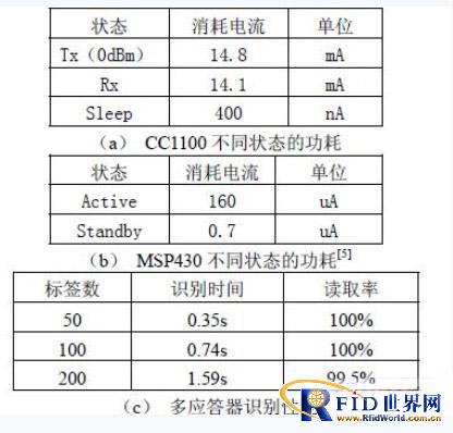 由于應答器靠電池供電,因此應答器的工作時間是系統重要指標。MSP430 和CC1100 在不工作時刻已處于休眠狀態,從而達到低功耗的目的。表1(a)和(b)分別說明了MSP430 和CC1100 在不同狀態下的耗電量。假設應答器有1%的時間處于場內應答,則可以計算,應答器工作時間為2 年,滿足應用要求。