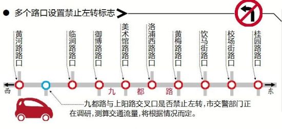 “這些路口車流量較小,禁止左轉可有效緩解擁堵,形成交通微循環。”王偉表示,九都路提升改造工程完工后,將設置交通隔離護欄,這些路口中間將設置交通隔離樁,僅供行人和非機動車通行。