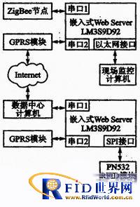 整個系統主要由ZigBee節點、GPRS模塊、嵌入式Web Server以及PN532 RFID模塊4個部分構成。其中ZigBee節點采用TI公司的CC2530方案實現,應用于現場的無線組網與數據采集、控制,ZigBee網絡中的終端節點將采集到的數據通過自組織網絡匯集到協調器節點;GPRS模塊采用SIMCOM公司的SIM900A模塊、ST公司的STM32 MCU,以及其他必要外圍電路組成,負責將數據轉發至控制終端,建立與固定IP的TCP/UDP連接;嵌入式Web Server采用TI公司的LM3S9D92實現,通過嵌入式Web Server對整個系統進行基本管理、數據顯示,并將ZigBee網絡中協調器節點采集的數據或GPRS模塊輸出的數據雙向轉發;PN532 RFID模塊由LM3S9D92驅動,實現修改、配置系統關鍵信息前的授權認證管理(身份識別),以保證系統信息不被惡意篡改。整個遠程數據采集系統結構如圖1所示。