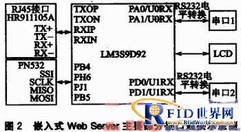 嵌入式Web Server采用TI公司推出的LM3S9D92Cortex—M3 MCU實現,該芯片集成以太網MAC+PHY接口,可直接連接含網絡變壓器的RJ45接口,大大簡化了以太網部分的外圍電路,十分符合設計需求。RFID模塊部分采用NXP公司PN532的解決方案,PN532是一個高度集成的非接觸讀寫芯片,它包含80C51微控制器內核,支持ISO/IEC 14443A/Mifare非接觸式智能卡讀寫,同時還具有集成了NFCIP-1的RF接口,傳輸速率高達424Kk/s,便于系統后期實現與NFC設備進行點對點通信等功能。LM3S9D92使用GPIO模擬SPI與PN532進行通信。嵌入式Web Server主要部分接口連接示意圖如圖2所示。