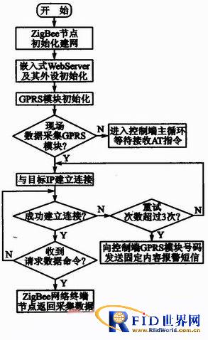 系統采用C語言進行開發,開發環境為RealviewMDK(Keil for ARM),并使用廠商所提供的片上資源驅動、庫函數和第三方組件。系統軟件設計分為3大主要部分;ZigBee網絡數據采集部分、GPRS模塊通信部分和嵌入式Web Server部分。整個系統主要流程如圖3所示。