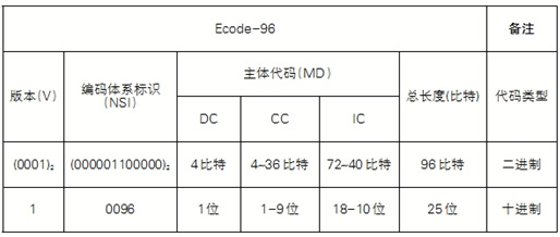 Ecode的一般結構為:“版本+編碼體系標識+主體代碼”,采用可擴展的方案,根據選擇的不同版本,長度不同,可根據需要靈活擴展。具體方案見表1。