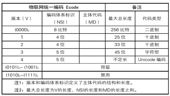 版本(Version,V):用于區分不同數據結構的Ecode。版本長度為4比特,也可采用1位十進制表示(版本10102~11112禁用),版本由我國物聯網統一編碼管理機構統一分配。不同的物聯網應用可以根據需要選擇合適的版本。