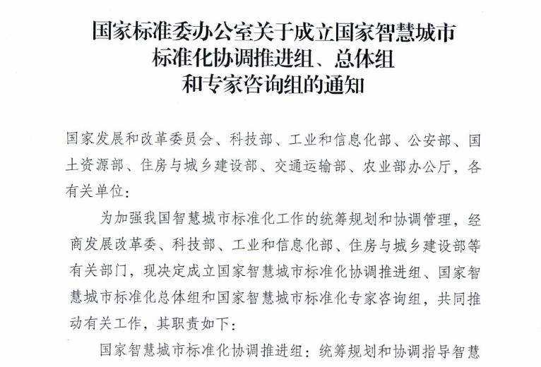 近日,國家標準化管理委員會發布了《關于成立國家智慧城市標準化協調推進組、總體組和專家咨詢組的通知》(標委辦工二[2014]33號)。