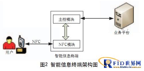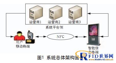 基于NFC的大容量信息推送方案是在NFC和寬帶移動通信技術的基礎上定向實現用戶與系統之間信息的交互和推送,該系統主要由移動終端、智能信息終端和系統平臺組成,系統框架如圖1所示。