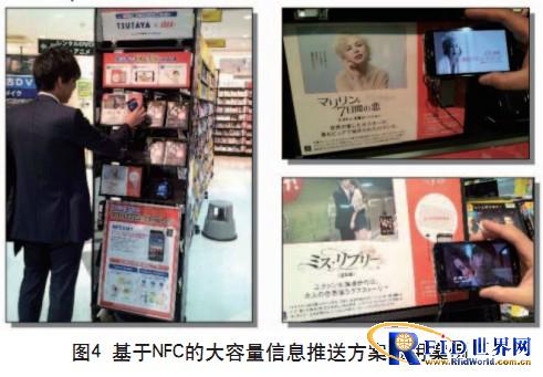 采用基于NFC的大容量信息推送方案的NFC終端不僅可以模擬卡片,而且可以實現高速、高安全性的數據傳輸。例如,在音像制品店里,如圖4所示,用戶可以通過NFC鏈路快速讀取智能海報上的NFC標簽,獲取大量音像制品的廣告簡介。如果用戶想進一步了解某一音像制品的具體內容,可以通過NFC鏈路發送 NDEF消息獲取音像制品部分片段的URL消息,通過移動終端與系統業務平臺建立的寬帶移動通信鏈路,下載或瀏覽音像制品的部分片段,快速了解相應產品的內容;如果移動用戶想購買此產品,只需將移動終端轉換到卡模擬工作模式,即可實現搜索、預覽、支付的一站式自助購物體驗。