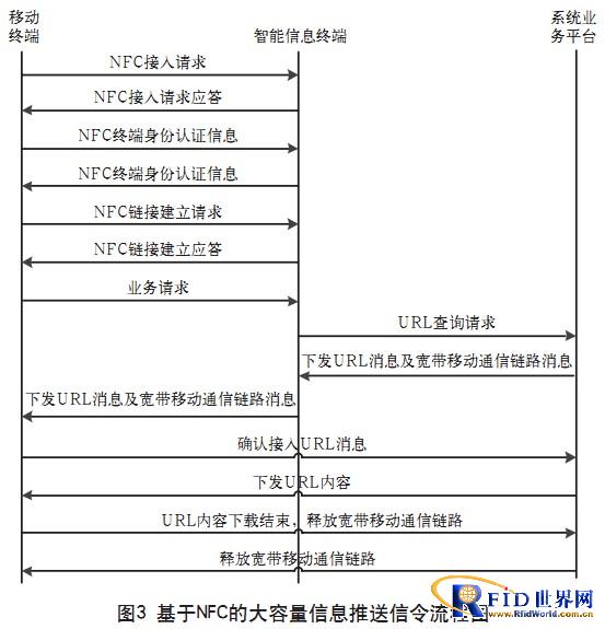 基于NFC的大容量信息推送方案通過NFC和寬帶移動通信融合系統,充分利用NFC技術短、頻、快和寬帶移動通信系統高速數據傳輸的優勢,實現高速、高安全性的信息交互,其信令流程如圖3所示。
