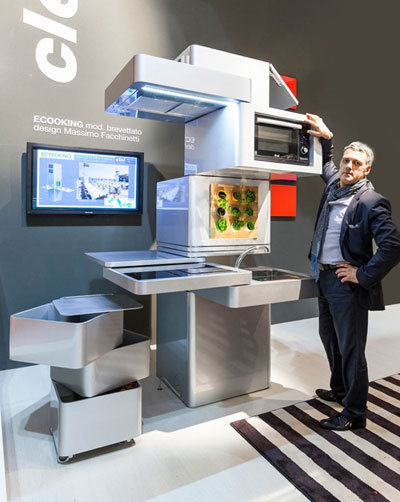 有趣的是,該廚房側面設計有紫外線燈和通風系統并提供了一個垂直懸掛的架子用來養些小植物,背面也還配備了太陽能電池,智能的為整體模塊分配電能。據說,未來還可以通過和智能廚房用具結合,通過太陽能給菜板、蒸蛋器等小型設備供電,可謂是把空間利用到了極致。