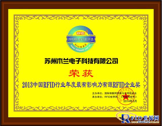 蘇州木蘭電子科技有限公司榮膺2013年度最有影響力有源RFID企業獎