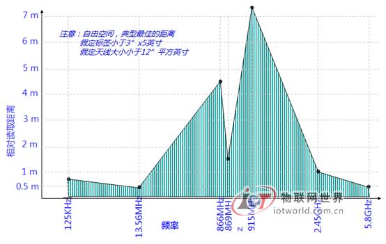 從圖中可以看到,在頻率800-1G的情況下工作距離是最遠的。其實早期的手機頻率也是在這個頻率范圍,就是因為早期的手機尺寸(早期的手機尺寸都很大,天線很長)也是這么大,最終做手機協議的科學家就定下了這個頻率。隨后的故事大家應該都知道了,就是做RFID的科學家由于是晚于手機的制定,只好跟著做手機的科學家坐下來開了個會,從人家剩下的頻段中找了一段給自己用。