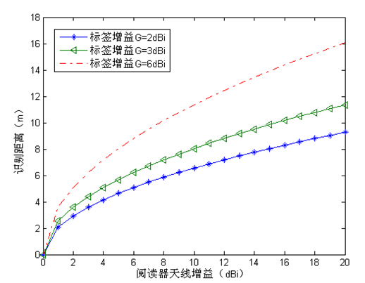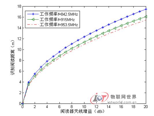 UHF RFID系統的識別距離與其工作波長成正比。通過使用較低的工作頻率,即較大的工作波長,可以增大系統的識別距離。天線工作頻率對識別距離的影響如圖所示,在圖4中,假定標簽天線增益為2dBi。圖中曲線描述了工作頻率分別為842.5MHz、915MHz、953.5MHz時系統識別距離隨閱讀器天線增益變化的情況。