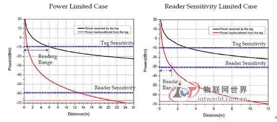 這里來舉兩個例子分別針對正向功率受限和反向閱讀器靈敏度受限。圖7中的兩個圖,分別代表高性能大功率閱讀器和低性能小功率